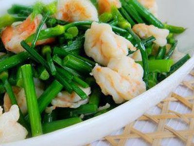 制法:将虾去肠去壳,爆香姜片,放入鲜虾炒熟。韭菜略炒,与虾一起上碟即可。